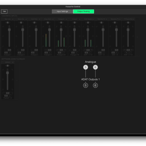 Once you have routed the audio signal to the desired ADAT Out on Push, you may also need to configure the Scarlett 18i20 via Focusrite Control to monitor the signal on the speakers connected to the interface.
